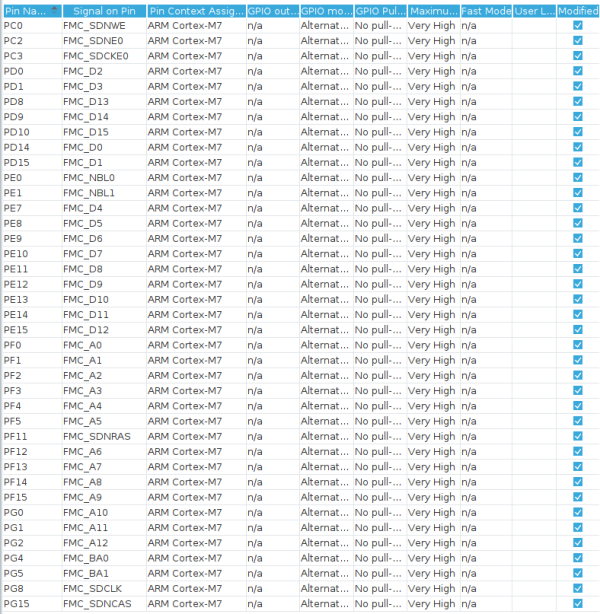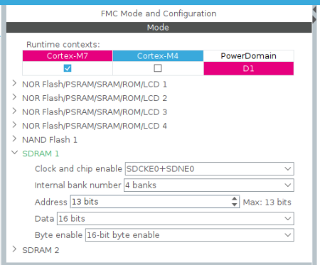 The base configuration of the FMC peripheral can be generated by CubeMX tool available in STM32CubeIDE. After adding the FMC to the Cortex-M7 context it should be configured as shown below: