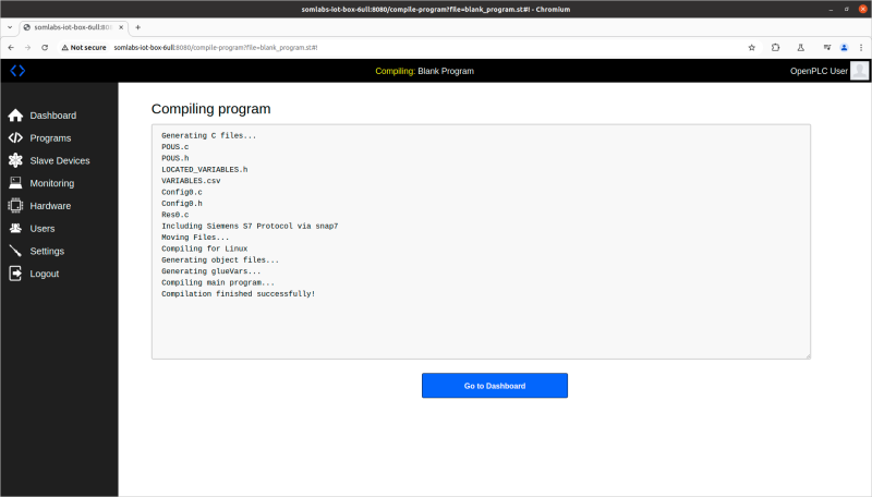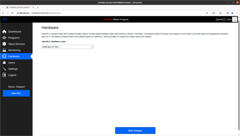 OpenPLC requires correct hardware driver to support hardware inputs and outputs. The driver for the SL-IoT-BOX is called SoMLabs IoT Box and should be selected in Hardware window. After clicking Save changes the driver will be compiled.