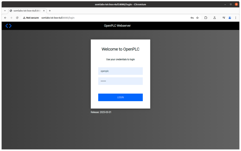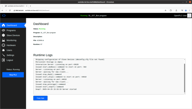 The default Debian system image for SL-IoT-BOX with VisionSOM-6ULL has OpenPLC runtime installed and enabled (https://autonomylogic.com/docs/openplc-overview/). After running the system, the OpenPLC webserver can be accessed using the network name or IP address with 8080 port: