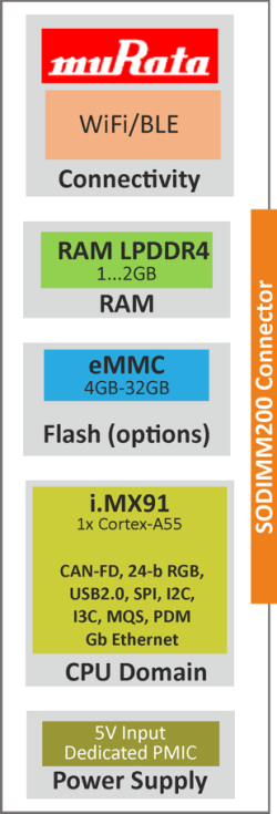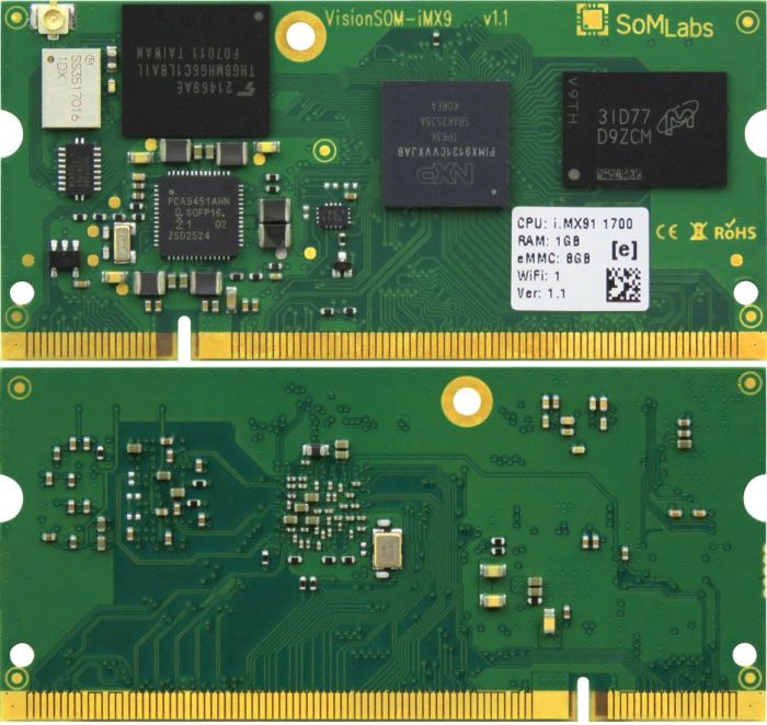 The VisionSOM-iMX91 (SLS17) is a general-purpose, low pwer and energy efficient, highly integrated SoM (System on Module). The option is fully certified Wi-Fi (802.11b/g/n) and Bluetooth (BLE 5.1) module. This module simplifies the carrier board design and is ideally suited for wireless application. The VisionSOM-iMX91 provides a variety memory configuration, including flexible range of LPDDR4 and eMMC Flash.